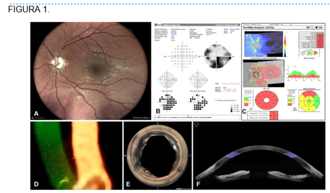 Figura 3-1. Glaucoma traumático de ojo derecho. Se presenta un caso ilustrativo de la evaluación paraclínica funcional y estructural de un paciente de 69 años, portador de un glaucoma traumático del ojo derecho. En la fotografía del polo posterior (fig. 3-1A) se identifica en el nervio óptico un adelgazamiento generalizado de la ceja neural (de predominio inferior), que se asocia con uno de casi la totalidad del complejo de células ganglionares perimaculares (fig. 3-1B) y otro focalizado de las fibras nerviosas peripapilares inferiores (3-1D). La afección paramétrica (fig. 3-1C) se identifica como un profundo escotoma arqueado superior que se fusiona por arriba con la mancha ciega, y a un escalón nasal superior, a través de un defecto paracentral por arriba de la línea media horizontal (fig. 3-1B). Cortesía: Dr. José Antonio Paczka.