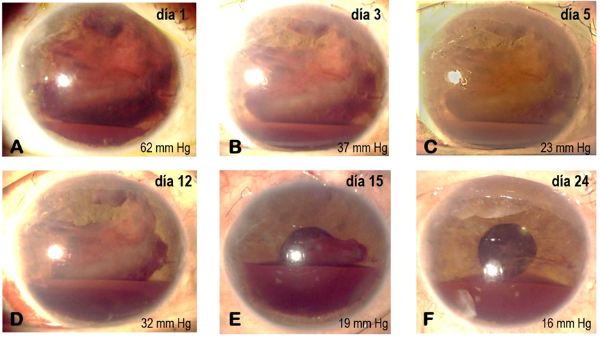 Figura 3-2. Caso con traumatismo contuso por fuegos artificiales que causó hifema significativo con HTO, cuya mejoría es notoria a lo largo del tiempo donde se asocia la reabsorción del contenido de sangre en la cámara anterior, el tratamiento hipotensor ocular tópico y sistémico y el paso del tiempo. Al final de la evolución (cinco meses después del traumatismo, la PIO logró cifras seguras [12 a 15 mmHg]) con el uso de una combinación fija doble de supresores de acuoso (timolol y dorzolamida, BID), la visión mejoró a 20/25, quedó sin daño glaucomatoso, pero con una recesión angular de 210°. Cortesía: Dr. José Antonio Paczka.