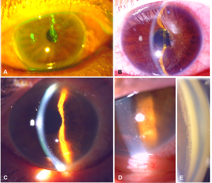 Figura 5-1. A. En el segmento anterior pueden observarse algunos cambios como signos asociados a diversas uveítis que pueden inducir hipertensión ocular e inclusive glaucoma. Se aprecia la presencia de úlceras de aspecto dendrítico resaltadas por fluoresceína, propias de la infección por herpes simplex. El desarrollo de sinequias posteriores puede generar una seclusión pupilar e inducir hipertensión ocular de ángulo cerrado con iris bombé B. Los depósitos retroqueráticos de pequeñas dimensiones (C) pueden observarse en el síndrome de Posner-Schlossman, la iridociclitis heterocrómica de Fuchs o la uveítis anterior idiopática; mientras que la presencia de depósitos retroqueráticos más grandes, en forma de “grasa de carnero” D, son más comunes en uveítis granulomatosas (sarcoidosis, tuberculosis, sífilis). Algunos cambios clínicos inflamatorios pueden desarrollarse en el ángulo irido-corneal (E) a través de sinequias posteriores que pueden llevar al cierre total del ángulo y la consecuente hipertensión ocular de gran magnitud, de naturaleza irreversible.
