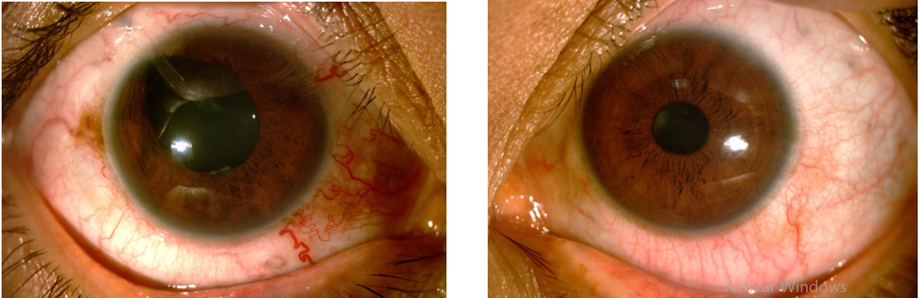 Figura 6-3. Ojo derecho muestra dilatación y tortuosidad de vasos epiesclerales respecto a conjuntiva del ojo izquierdo
