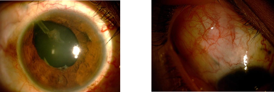 Figura 6-4. A. En el OD se evidencia discoria y sinequias posteriores. B. Válvula de Ahmed® en cuadrante superotemporal de ojo derecho.