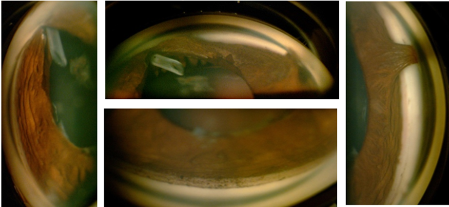 Figura 6-6. Gonioscopia: imagen real de ojo derecho, presencia de tubo valvular y sinequias anteriores periféricas.